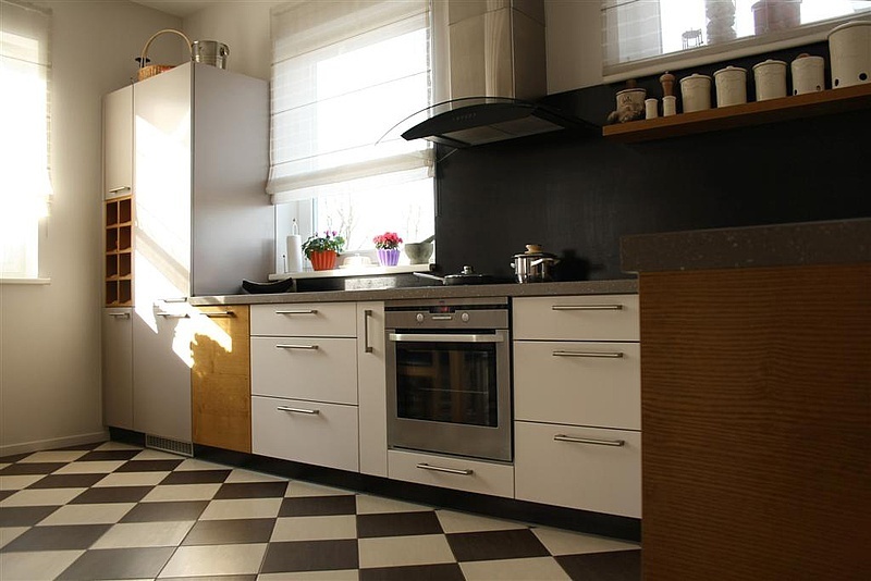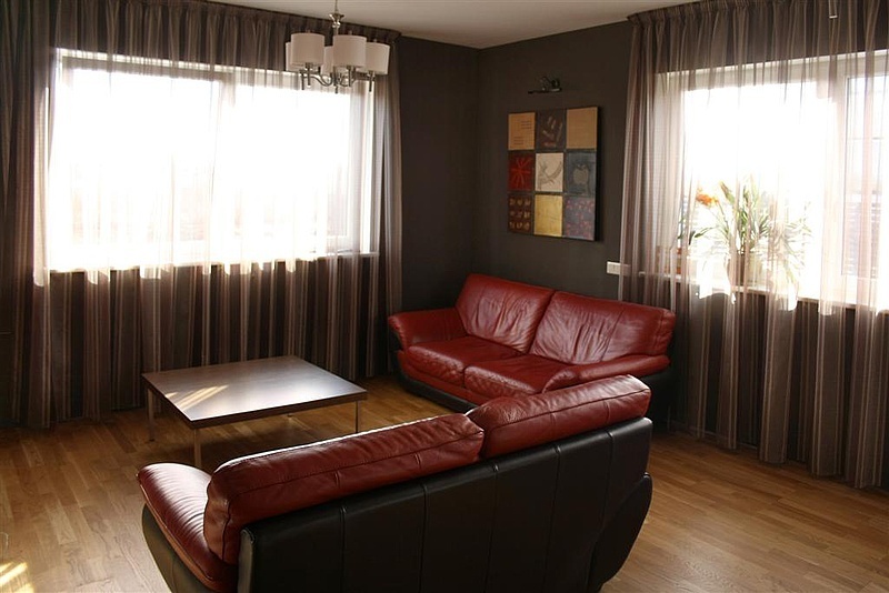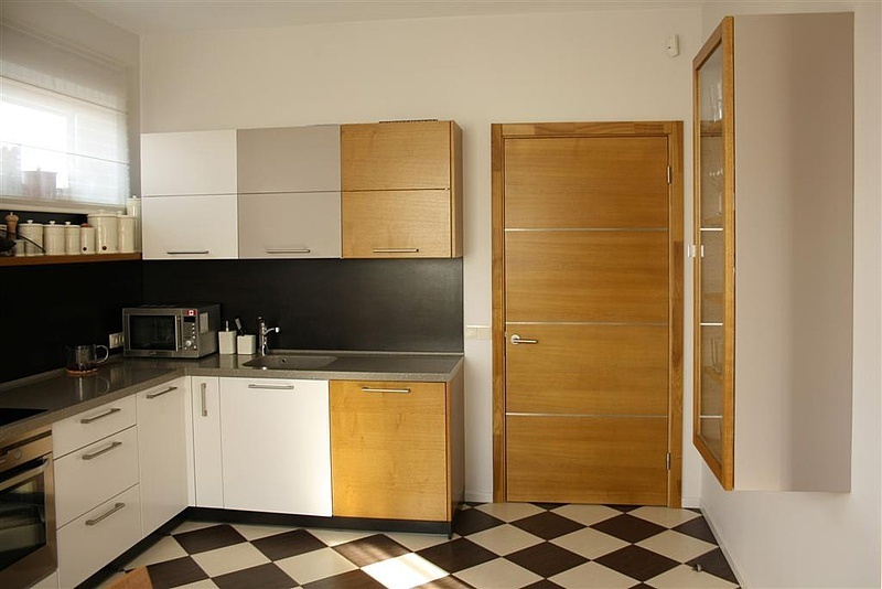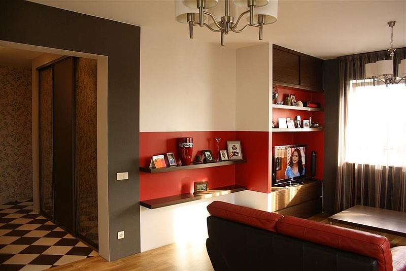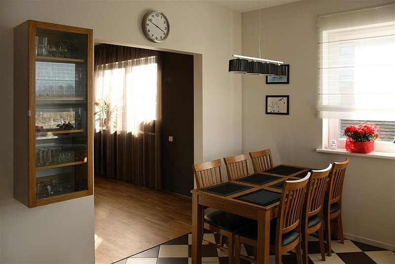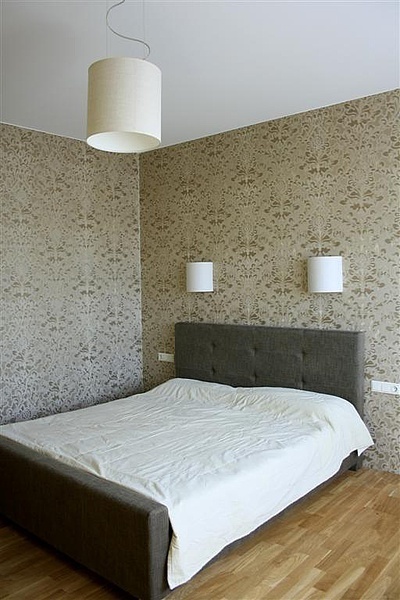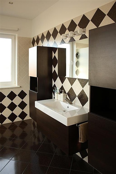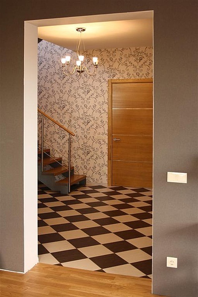 Divstāvu privātmājas interjerā dominē krāsu kontrasti un drosmīgi grafiskie ornamenti - tapetēs svītras savienojumā ar ziediem, šaha rakstā izkārtotas flīzes, spilgti krāsu salikumi bērnu vannas istabā un netipiski tumšpelēka toņa sienas atpūtas zonā. Krāsu izvēle dzīvojamā istabā pakārtota klientu esošo mēbeļu toņiem.