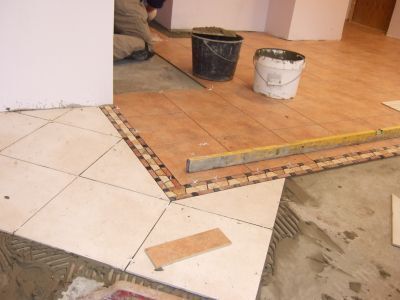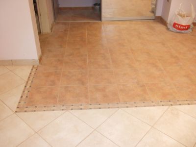 Klājam tā, kā tika aprakstīts iepriekš, taču šajā gadījumā lielāka nozīme ir mērījumiem, lai nebūtu jāgriež daudz flīzes. No centra pa perimetru ieklājam vienas krāsas un izmēra flīzes. Tad sekos cita veida flīzes, ko arī klājam pa perimetru.