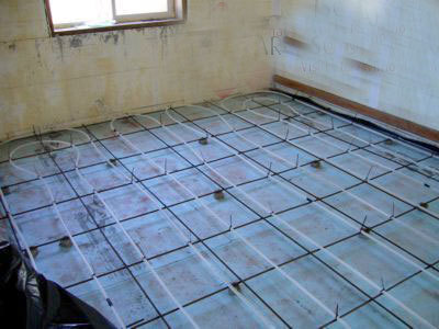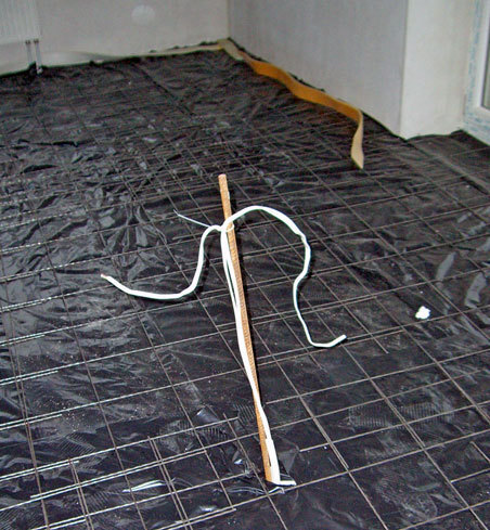 Apkures kabelis. Apkures kabelis tiek uzklāts uz armatūras un nostiprināts. Kabelis un armatūra tiek pacelti līdz betona kārtas vidus līmenim. Kabeli nedrīkst pārāk cieši piestiprināt armatūrai.