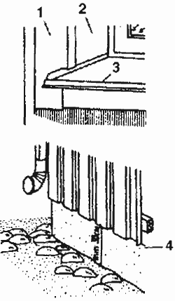 1 - loga apmales sānu dēlis; 2 - logu ailas nogāze; 3 - skārda noteka; 4 - slīpi nozāģētie apšuvuma dēļi.