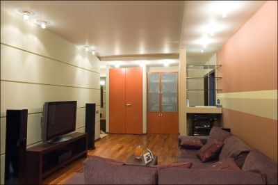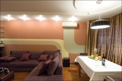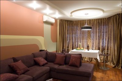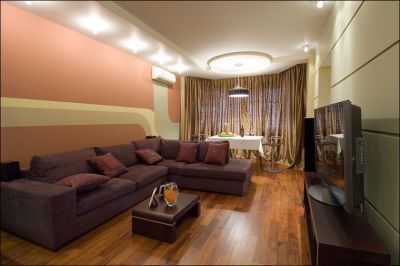Saimnieki labprāt piekrita idejai ar apgaismojumu izcelt atsevišķas viesistabas zonas, kur priekšroka dota siltām krāsām. Ģimenē ir bērni, tādēļ dizaineri centās izveidot tādu interjeru, kas ņemtu vērā visu ģimenes locekļu vajadzības, bet namamātei nevajadzētu satraukties par netīrām mēbelēm.