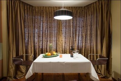 Telpa, kas ir atvēlēta viesistabai, ir caurstaigājama un iegarenas formas, tādēļ tās vienu daļu tika nolemts atvēlēt ēdamistabas ierīkošanai. Tādējādi no vienas telpas izveidotas divas. Ja ēdamistaba netiek izmantota, galdu var iznest, aizkarus atvērt, bet palielinājusies platība viesistabai piešķirs jaunu skanējumu.