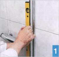1.Novietojiet sienas profilu paliktņa malā; izmantojot līmeņrādi, pārliecinieties par tā vertikālo stāvokli, ar zīmuli atzīmējiet urbuma vietu.